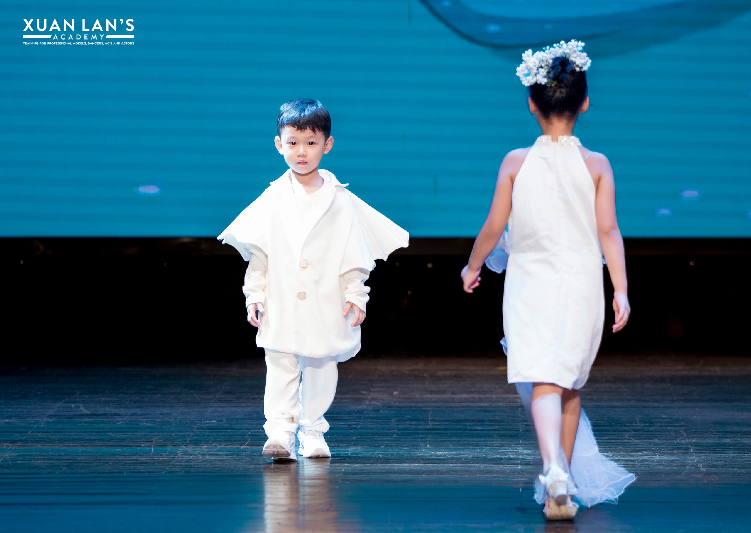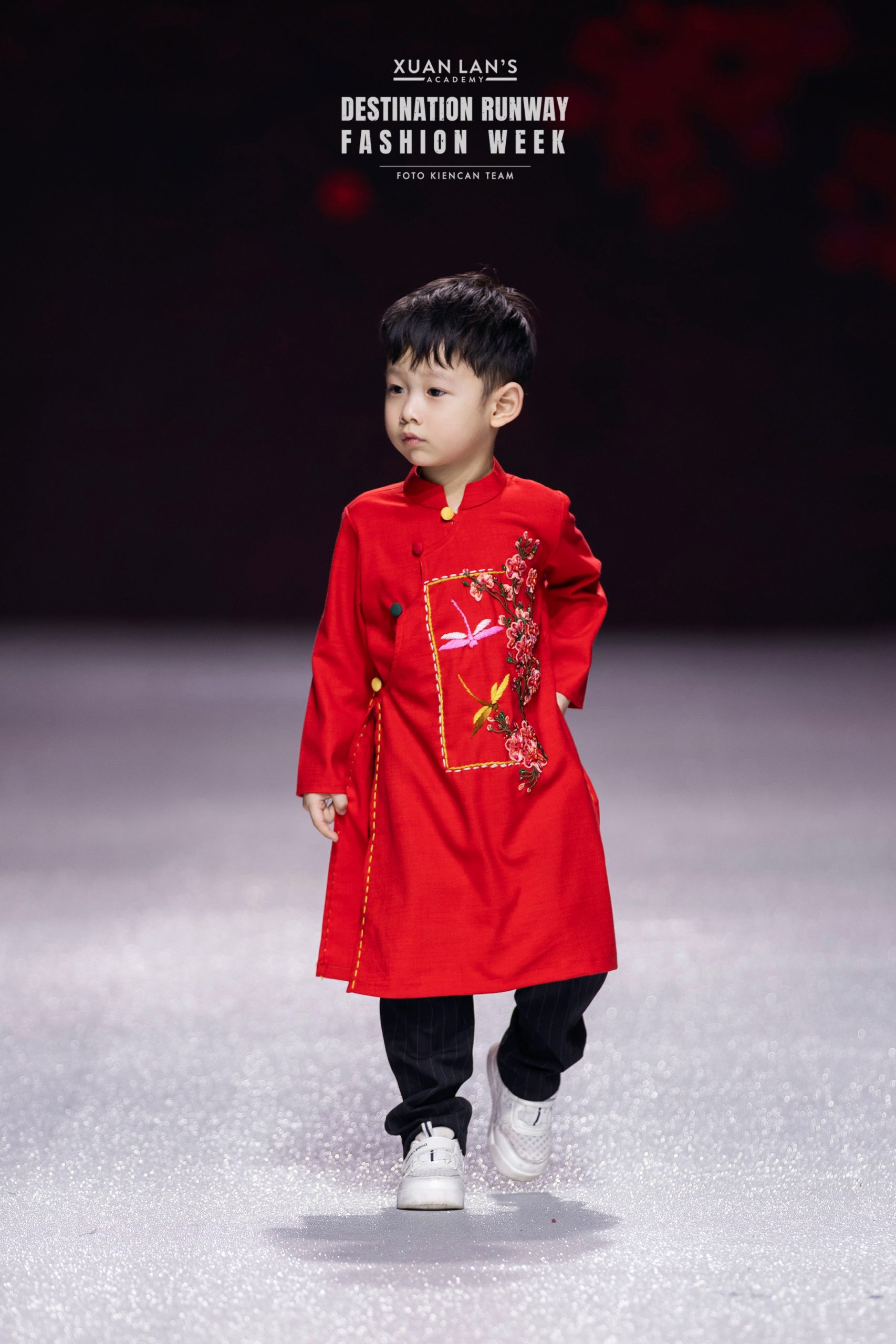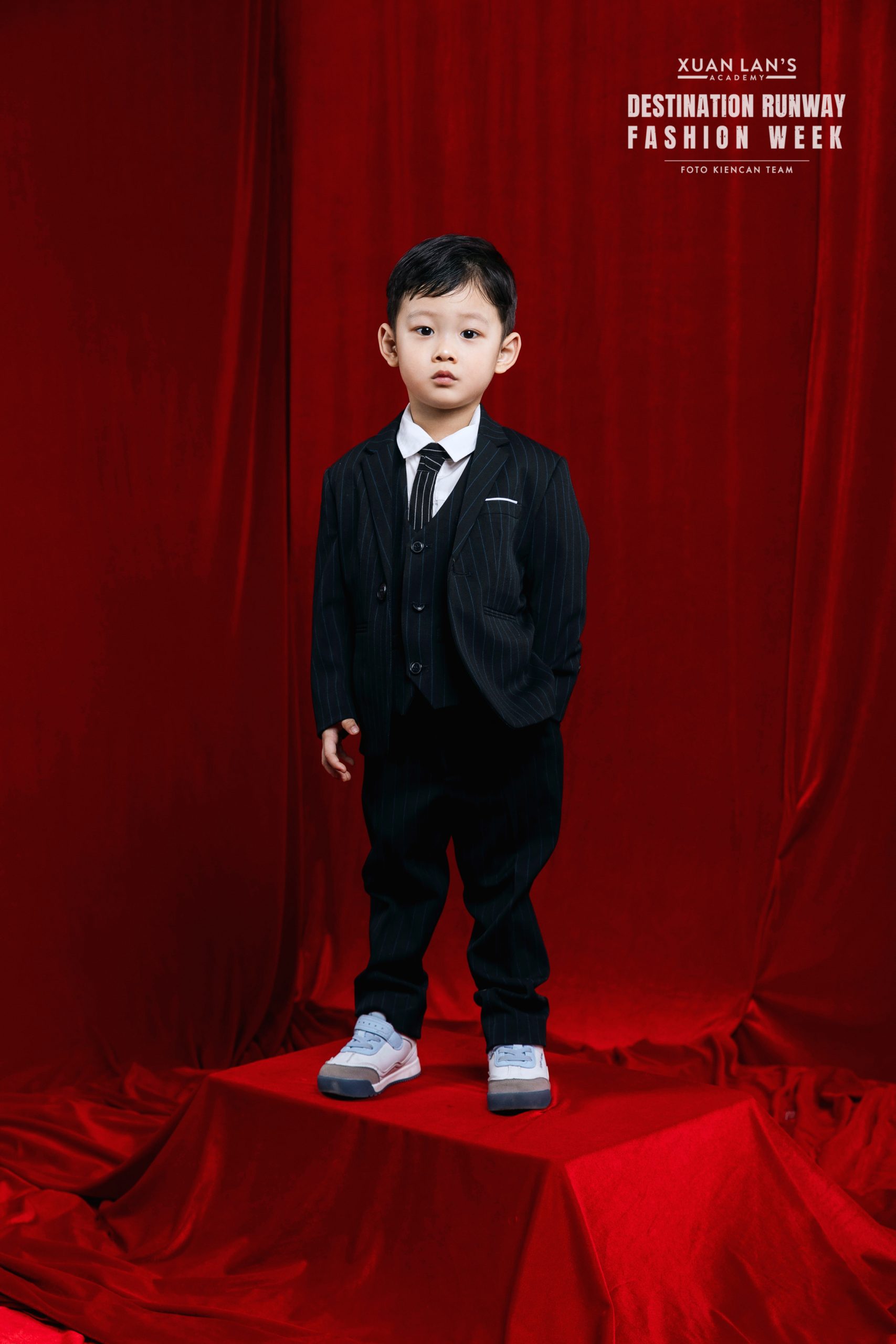 Tran Dai Quang is currently studying at an international STEAM school. Before discovering his connection with the arts, the four-year-old boy was rather shy and reserved in front of crowds. Things began to change when Xuan Lan Academy organized a recruitment program in Quang Ninh. Hoping to give their child more opportunities for physical activity and social interaction, his family encouraged him to participate. A child’s natural curiosity led him to his first classes, where stage lights and the rhythm of fashion gradually became familiar.