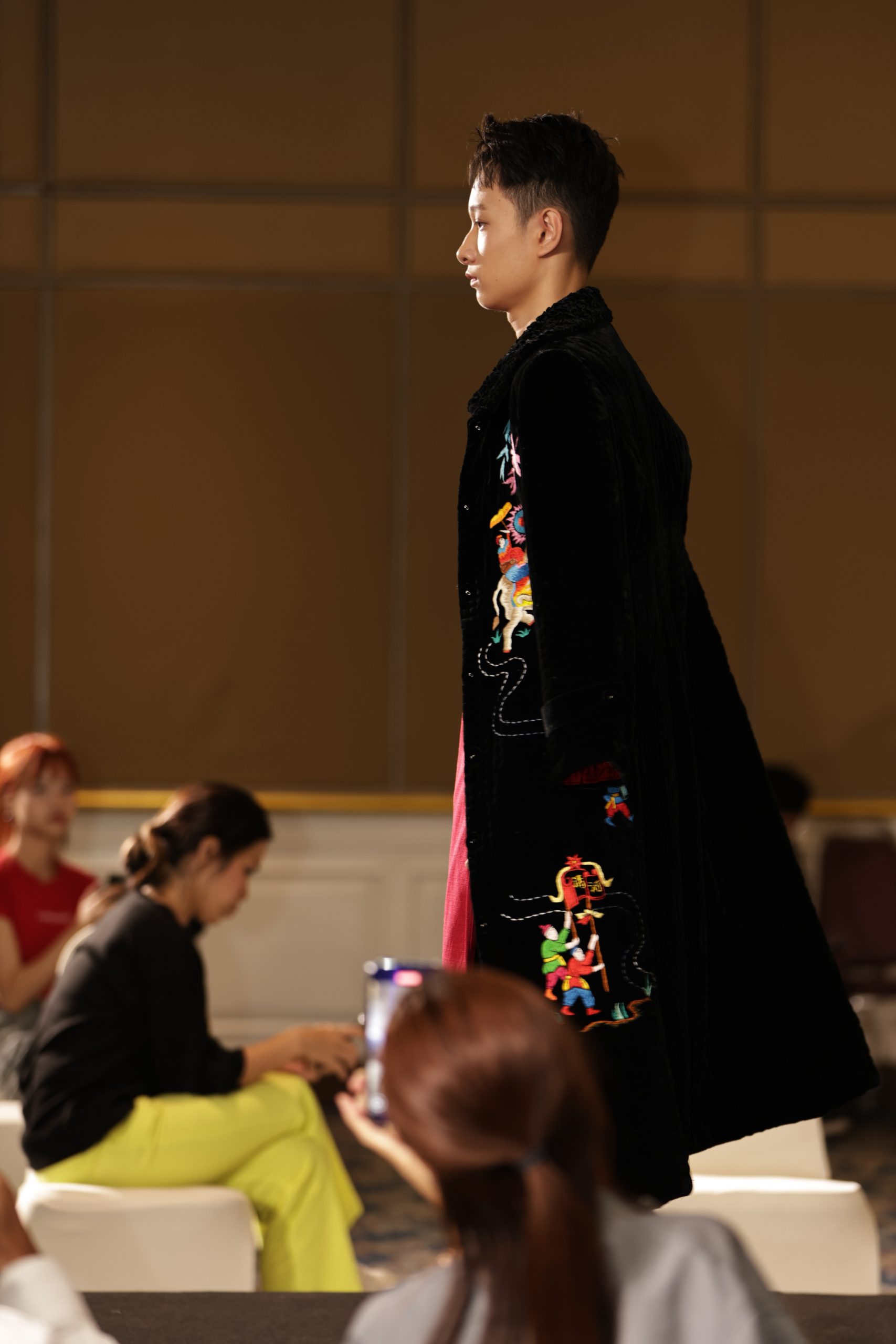 In the moment he turned, the black velvet cloak swept lightly with his motion, revealing layers of hand-embroidered detail: sometimes a festive procession, sometimes folk animals, sometimes a rustic village game. It felt as if Dong Ho paintings were reborn right on the runway—familiar yet deeply moving.